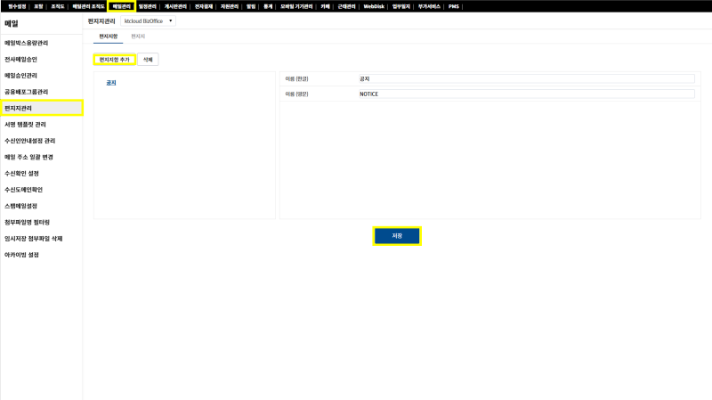 2. 편지지>편지지 추가를 통해 내용을 입력하여 저장해줍니다.