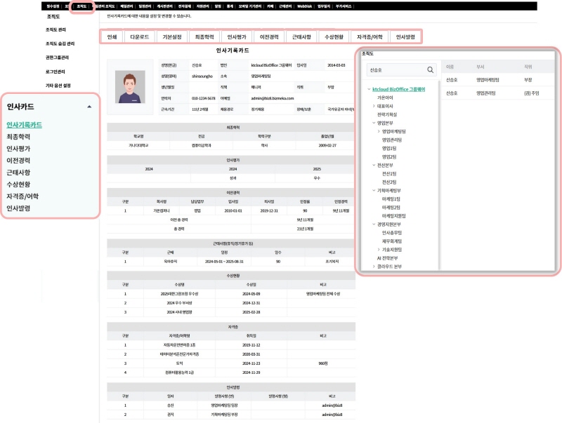 kt비즈오피스 그룹웨어와 함께 인사기록카드를 활용해 직원 정보를 한 곳에서 관리하고,